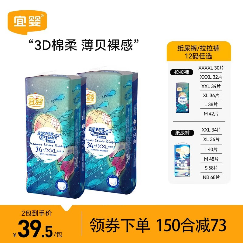¥82 宜婴宜婴梦想家小内裤 婴儿超薄柔软透气拉拉裤男女宝宝通用尿不湿 拉拉裤XXL34片*2包 152
