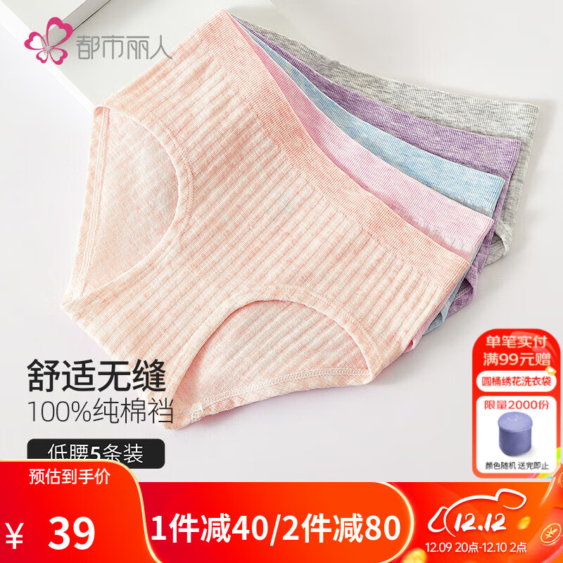 ¥79 都市丽人内裤女5条装低腰无痕无缝亲肤透气吸湿女士三角组合内裤 2K35AU 花纱粉花纱灰花纱兰花纱虾花纱紫 160/90(F) 89
