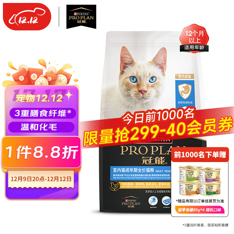 ¥290 冠能猫粮室内成猫猫粮7kg 减少毛球提高免疫 新老包装随机发 395