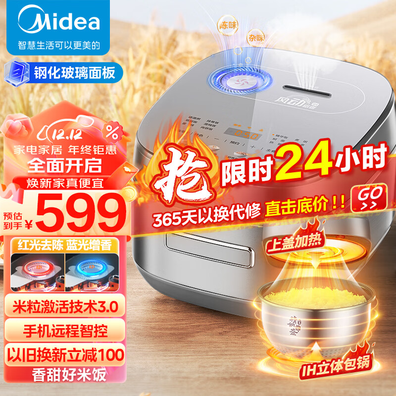 ¥549 美的(Midea)风动稻香Pro电饭煲电饭锅4L立体IH电磁加热一键双层快速煮家用智能电饭煲MB-HS433(3-8人) 599