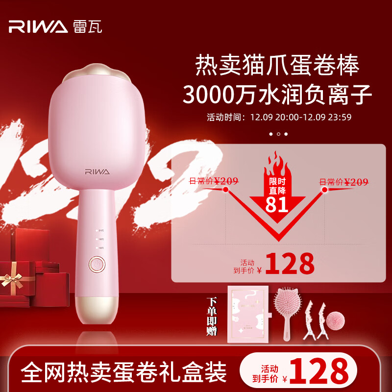 ¥189 雷瓦(RIWA)卷发棒蛋卷棒夹板负离子大蛋卷水波纹烫发棒卷发神器卷发器蛋蛋卷发棒8120负离子夹板 199