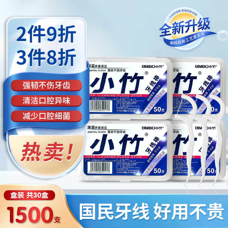 ¥9.9 小竹牙线棒超细成人牙签线圆线盒便携经典强韧型剔牙神器 强韧牙线棒50支*5盒 39.9