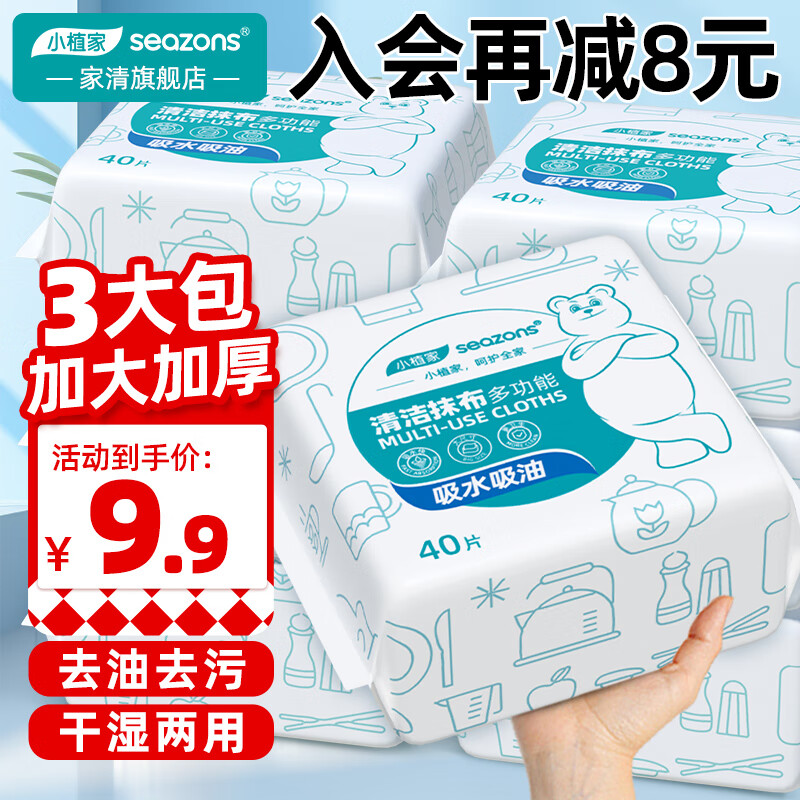 ¥6.9 小植家懒人抹布加厚不沾油厨房纸巾一次性洗碗布吸水不掉毛神奇抹布 厨房抹布40抽*3包福利款/共120抽 9.9