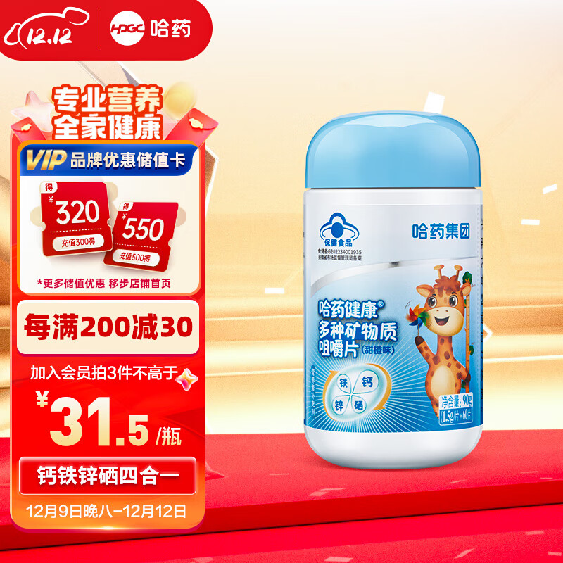 ¥54 哈药 钙铁锌硒儿童4-17岁多种矿物质咀嚼片60片 葡萄糖酸锌 钙片儿童青少年学生成人补钙铁锌硒多种矿物质 59