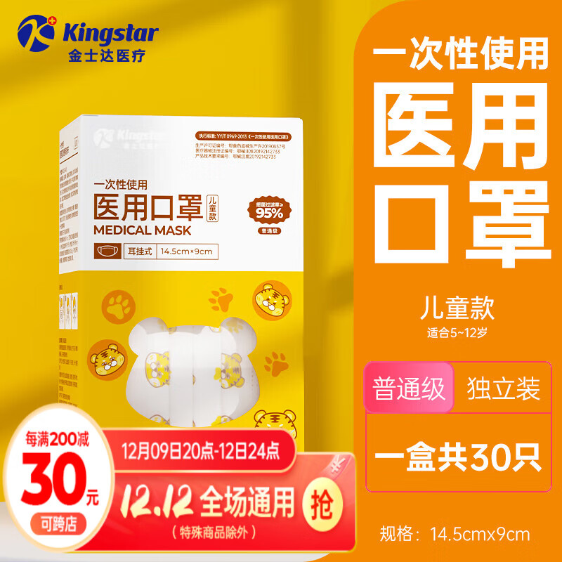 ¥5.9 金士达儿童医用外科口罩一次性独立包装婴幼童儿童防尘病毒肺炎防过敏性鼻炎支原体口罩蓝色 【医用款5-12岁】儿童独立装小老虎30只/盒 12.9