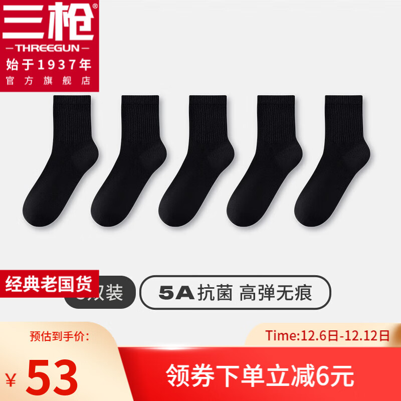 ¥54 三枪(THREEGUN)【5双】袜子5A抗菌中筒袜男款纯棉防滑消臭秋冬袜纯色高弹男袜 5黑 均码 59