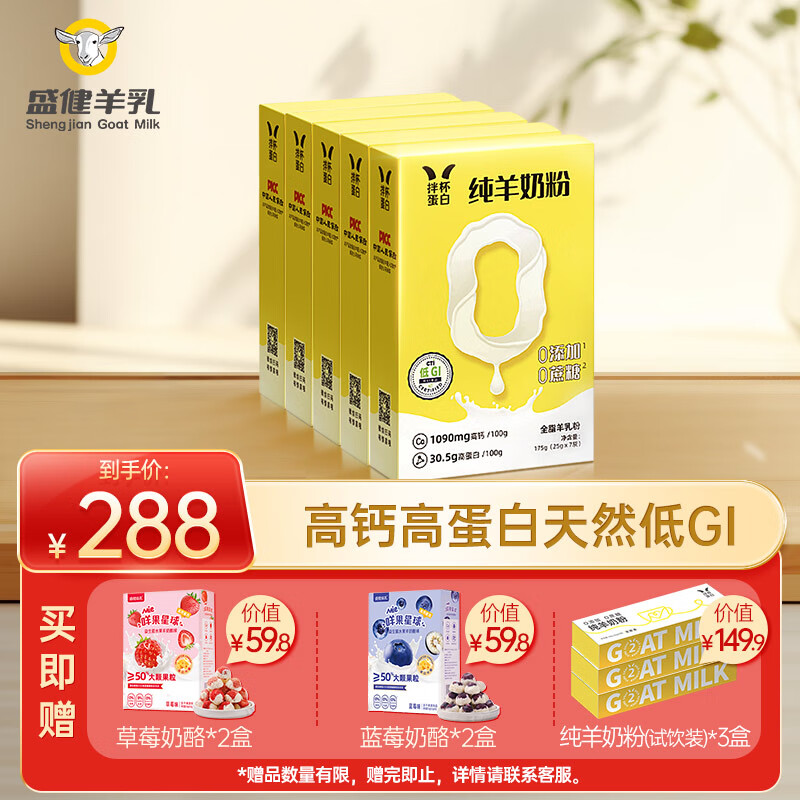 ¥348 盛健天然低GI中老年成人A2纯羊奶粉高钙高蛋白学生生羊乳奶粉5盒装 398