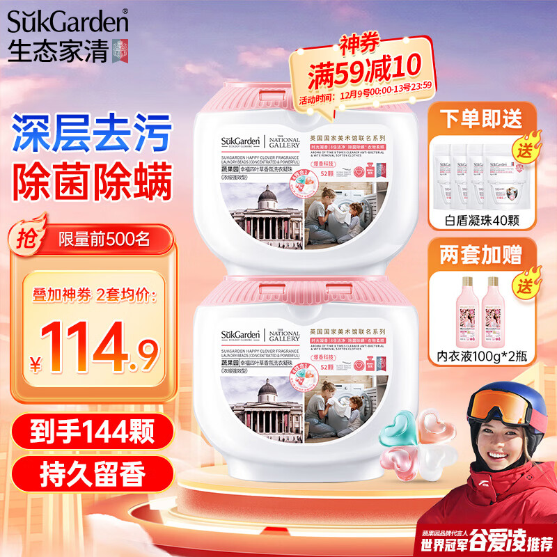 ¥129.9 蔬果园(SukGarden)4合1幸福四叶草香氛洗衣凝珠浓缩洁净护衣留香除螨抑菌柔顺留香珠 2盒4袋共144颗【除菌留香】 139.9