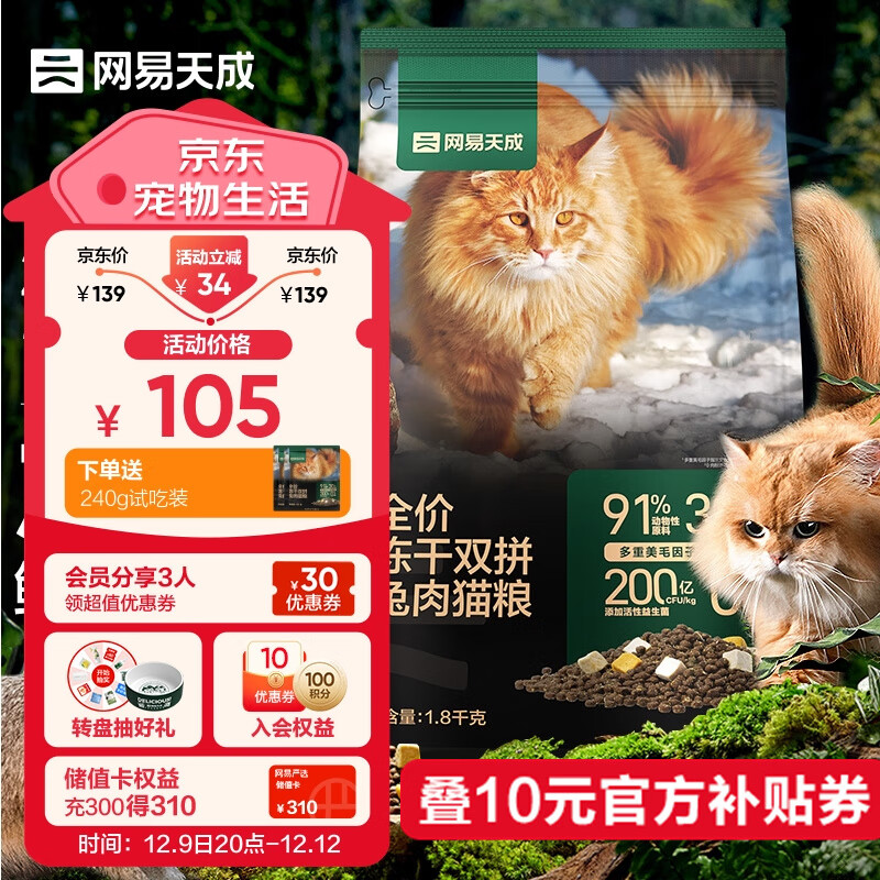 ¥95 网易严选天成全价冻干双拼兔肉猫粮幼猫成猫全价鲜肉猫粮1.8kg 105