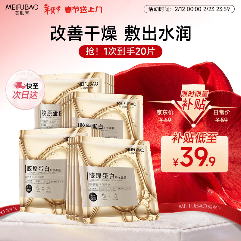 美肤宝胶原蛋白补水面膜20片装仅39.9元!熬夜后肌肤救星,水润弹润迎新春