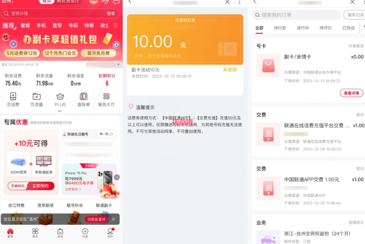 联通APP最新版--首页横幅进入副卡--随便点一个申请,直接到50减10元话费券,然后再去“我的-进行中”取消一下就行了