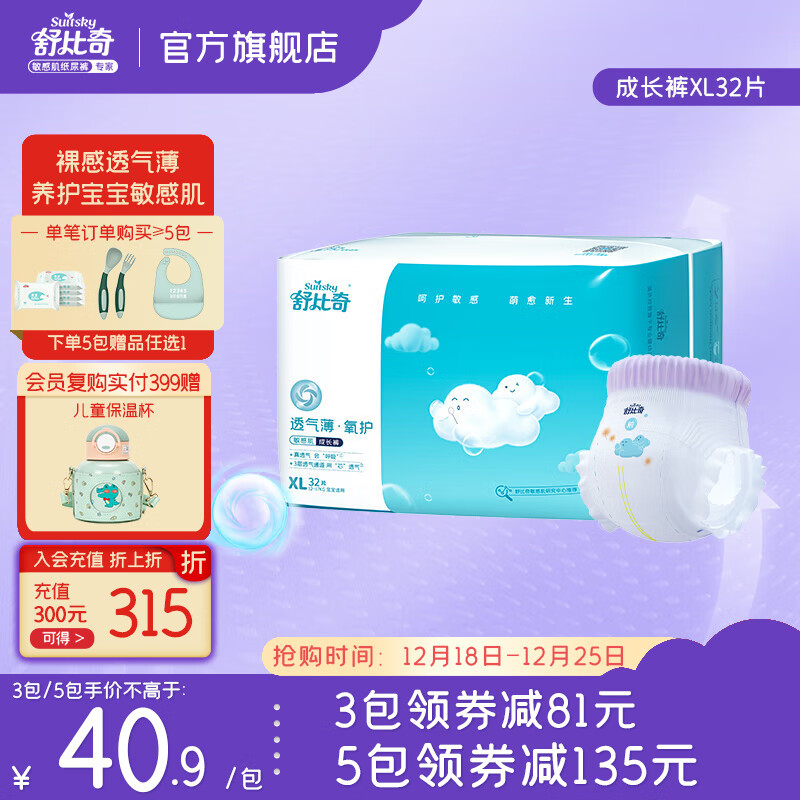 ¥46.9 舒比奇(Suitsky)透气薄敏感肌拉拉裤新生儿超薄柔软成长裤婴儿尿不湿国产尿裤 拉拉裤xl码32片【12-17KG】 67.9