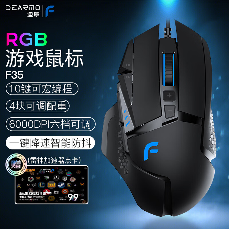 ¥119 迪摩(DEARMO)F35有线鼠标游戏鼠标电竞RGB鼠标绝地求生吃鸡鼠标带砝码配重块鼠标 黑色 6000DPI 129