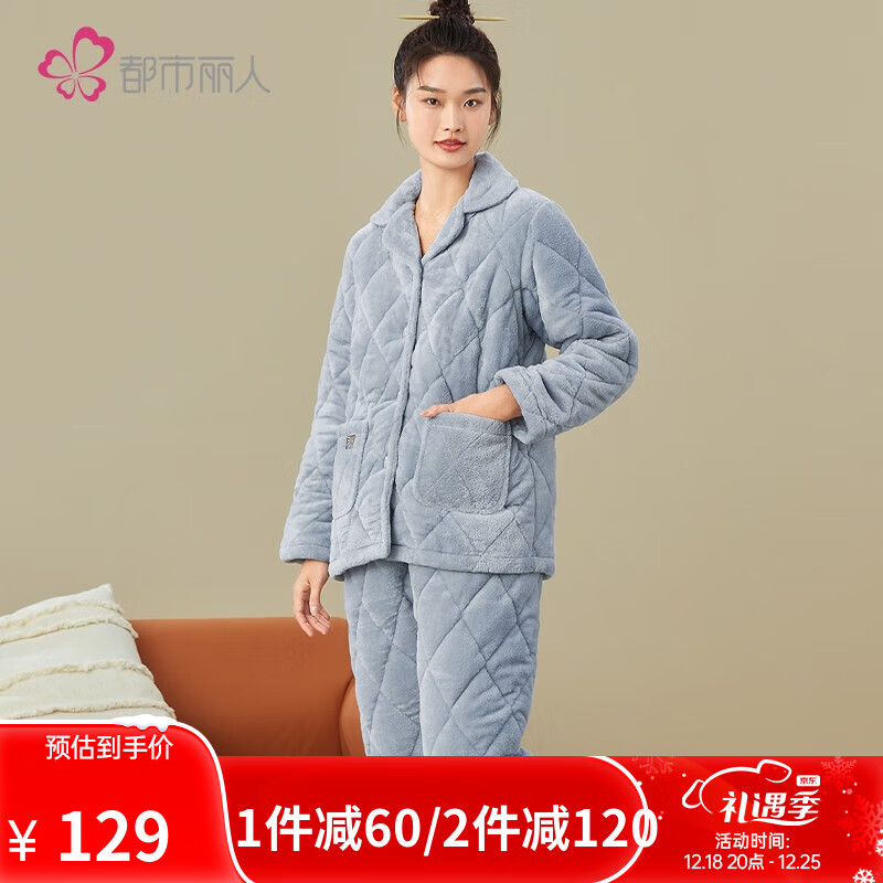 ¥189 都市丽人睡衣加厚夹棉细密保暖法兰绒翻领简约情侣款家居服套装 2H21C1 雾蓝-女款2H21C1 L 209