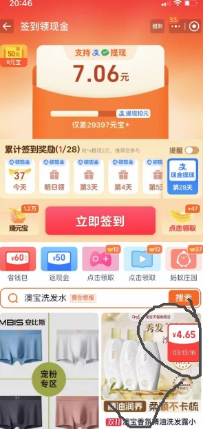 拍2瓶选项51.9元,领20元券,先收藏--在签到页面随机弹红包 并且找到搜索框(如图所示)输入想要的 澳宝香氛精油洗发露 名称找到该商品即可抵扣(一般是名称的前几个字就可以了),小编弹16-4.65元随机红包,实付低至19元左右;
