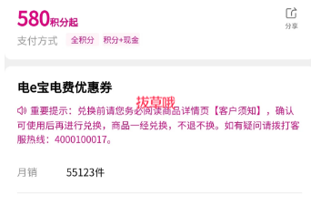 只需要在积分商城搜索【电费】,只需要580积分就可以兑换5元电费抵扣券,电费是刚需,换这个绝对不会亏。