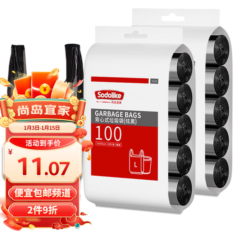 ¥10.3 Sodolike背心手提式垃圾袋中号加厚50*65cm*5卷黑色 200只黑色 12.3
