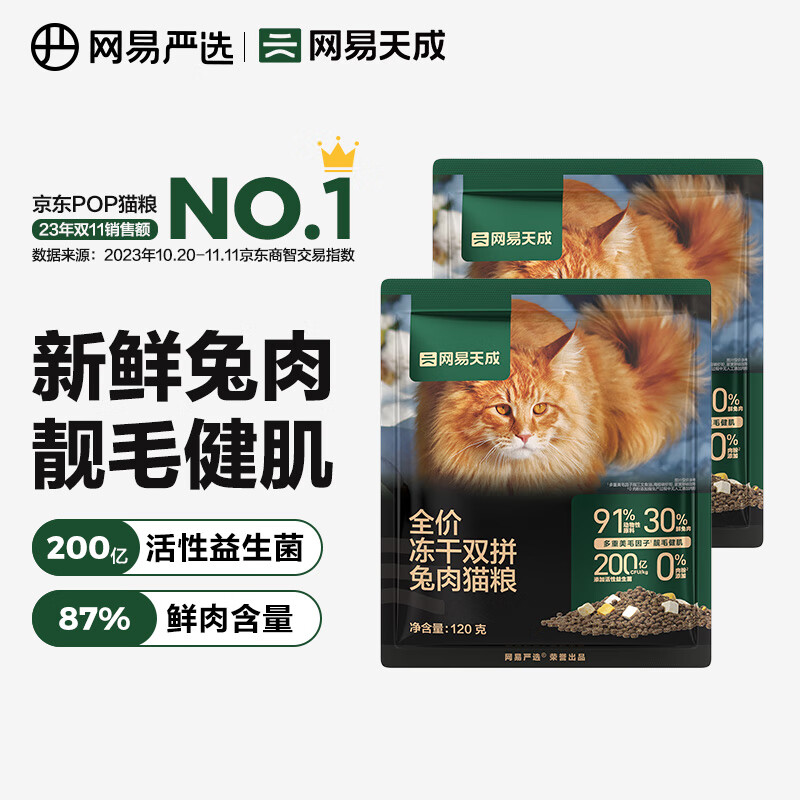 ¥7.9 网易严选全价冻干双拼兔肉猫粮 幼猫成猫主粮 全阶段通用无谷粮美毛健肌 【高蛋白低脂肪】120g*2袋 19.9