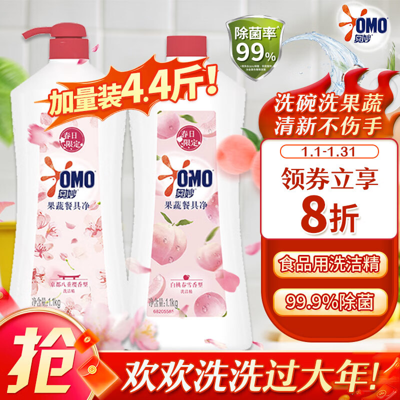 ¥27.32 奥妙大桶食品级洗洁精果蔬餐具净 1.1KG*2 樱花+白桃香型 31.12