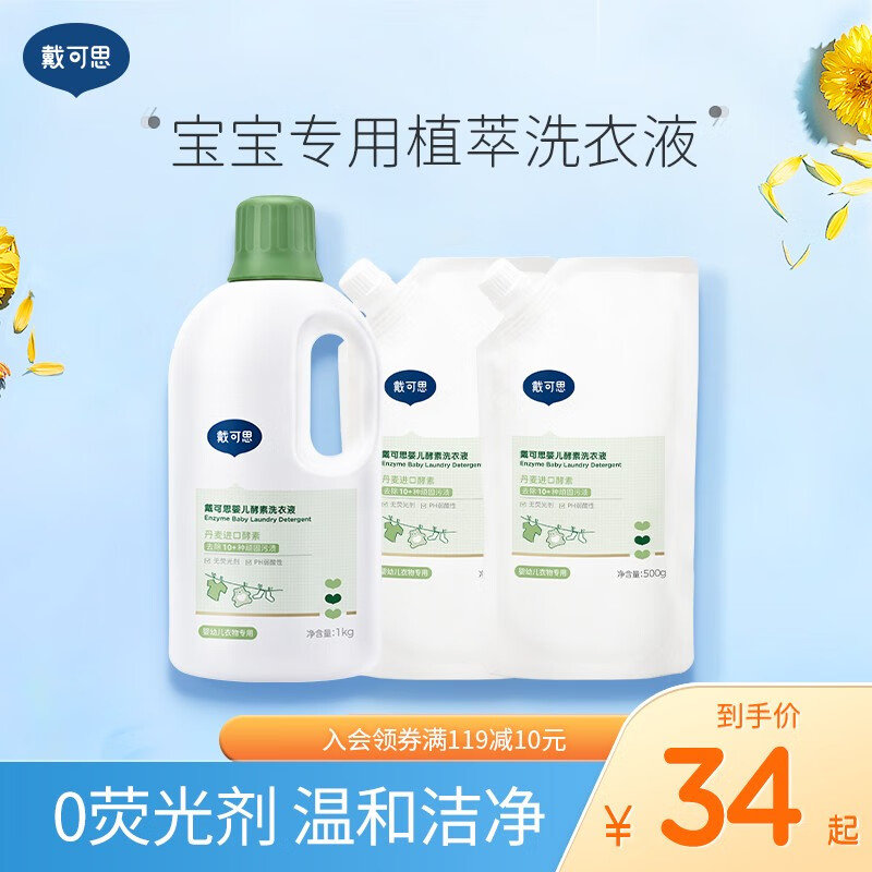 ¥34 戴·可·思(Dexter)婴幼儿洗衣液宝宝儿童酵素内衣内裤洗衣液多效去渍家庭版 1瓶装1000g+补充装500g*2 36