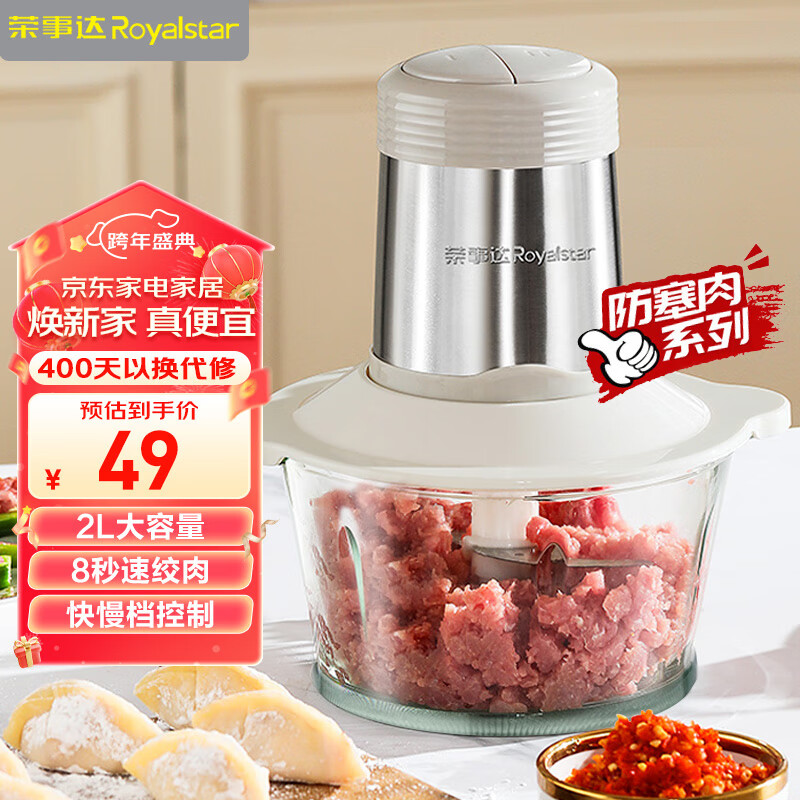 ¥39 荣事达(Royalstar)绞肉机家用电动多功能料理机切菜婴儿辅食机碎肉搅肉机饺子肉馅蒜蓉机RS-JR30R5【玻璃碗1副刀】 49