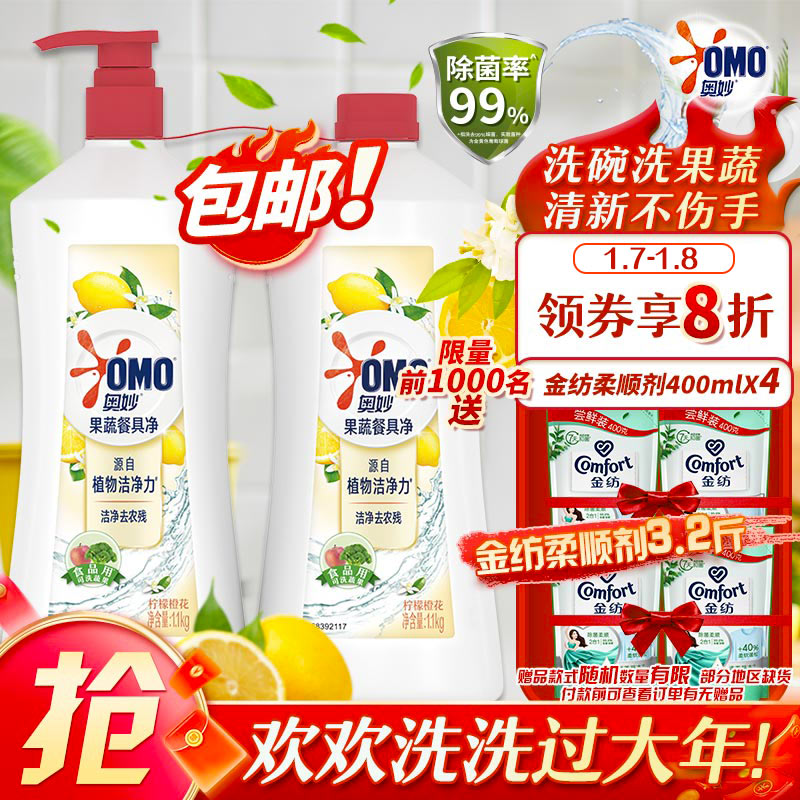 ¥27.32 奥妙果蔬餐具净 大桶装 柠檬橙花 不伤手去农残 食品级洗洁精 1.1kg*2 31.12