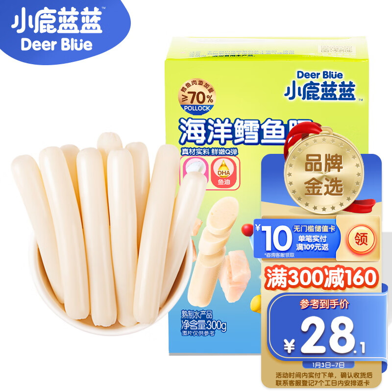 ¥50.9 小鹿蓝蓝_深海鳕鱼肠 宝宝零食儿童零食添加益生元鳕鱼肉肠 300g 59.9