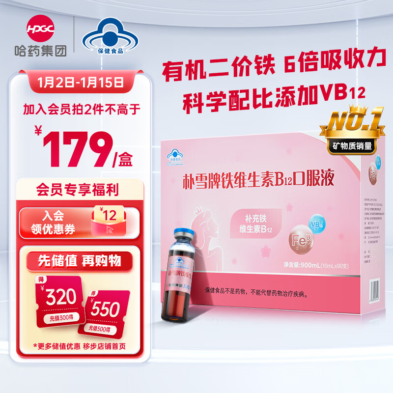 ¥139 哈药 六 朴雪牌铁维生素B12朴血口服液小粉瓶 0防腐剂 儿童成人孕妇中老年补铁口服液90支女性送礼礼盒 199