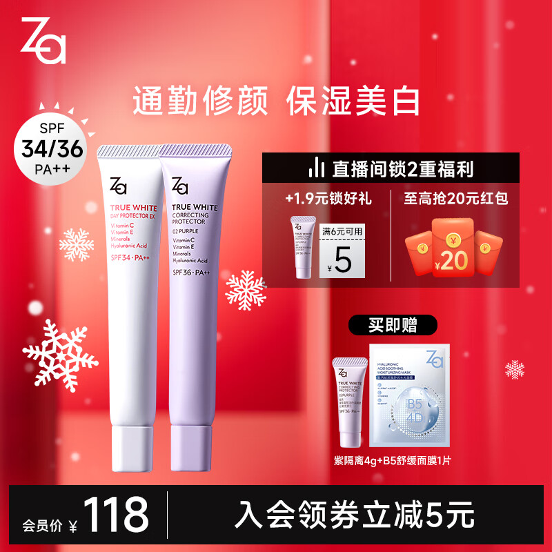 ¥118 姬芮(ZA)双色隔离霜防晒遮瑕霜妆前乳三合一白色35g+紫色35g 送女友 123