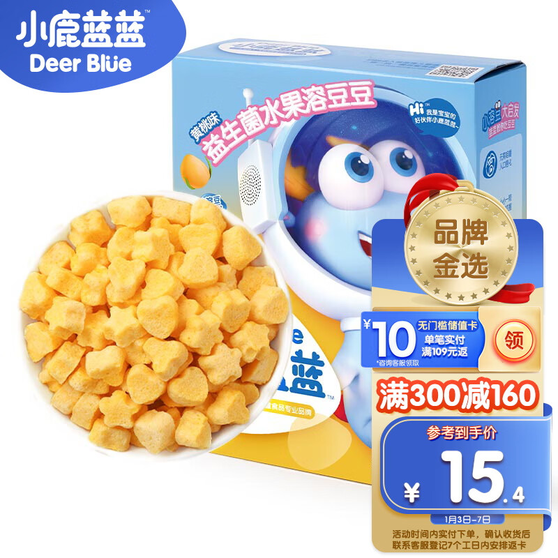 ¥12.9 小鹿蓝蓝_益生菌水果溶豆豆 20g 黄桃味 冻干宝宝零食溶豆添加益生菌 32.9