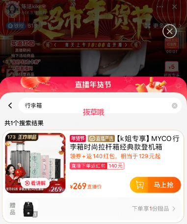 26寸选项,去手淘直播间“陈洁kiki”找到173号链接,拍下实付208元包邮,返140红包,+增20寸1个,相当于68元到手2个;