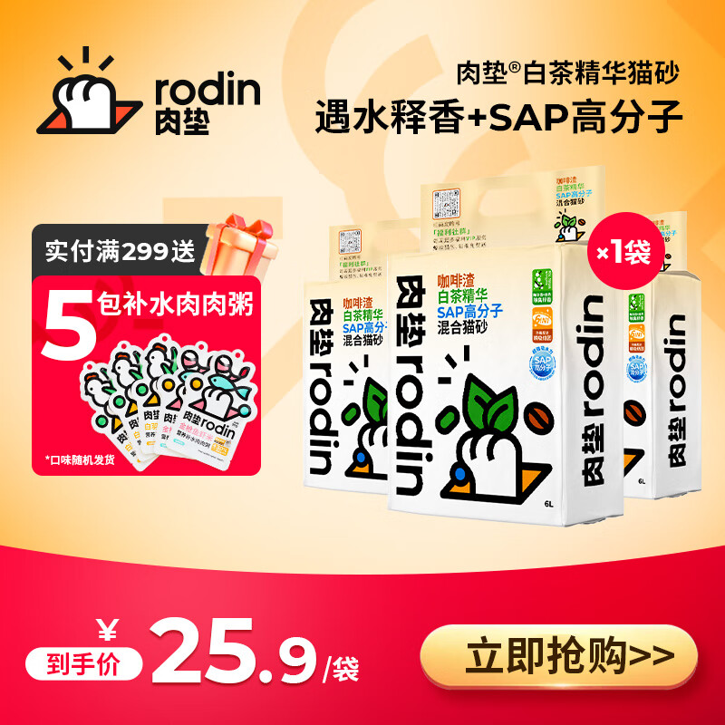 ¥24.9 肉垫(rodin)多种类咖啡渣膨润土猫砂强效除臭低尘高分子混合猫砂TT 白茶 2.5kg*1袋 29.9