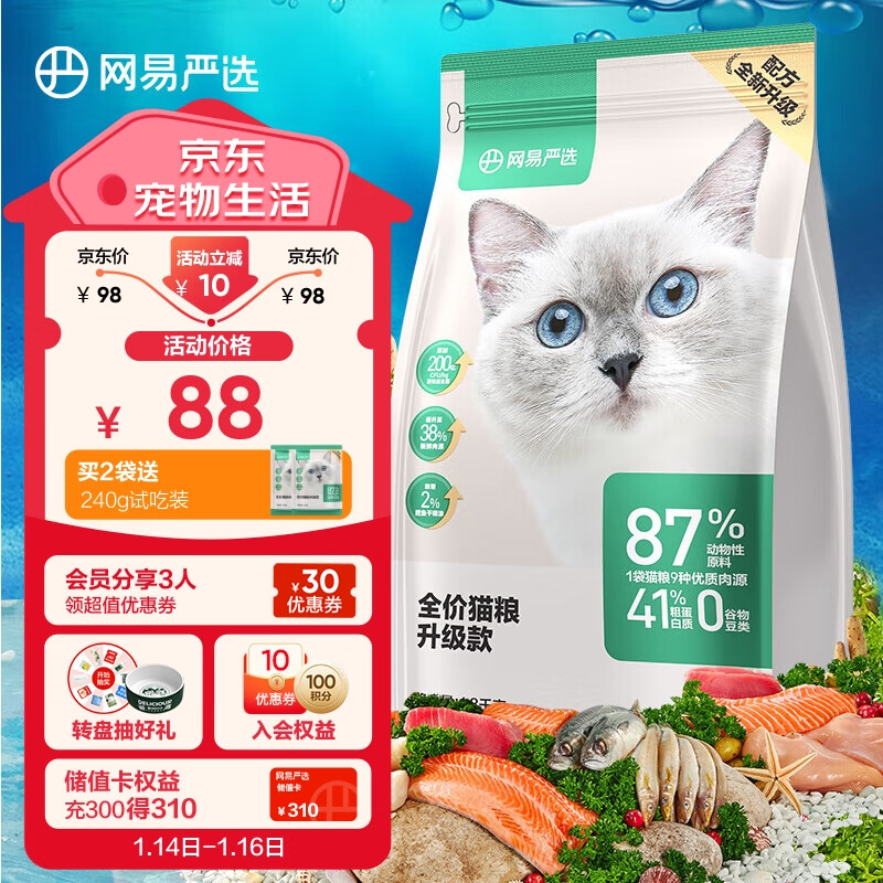 ¥83 网易严选 全价猫粮 居家宠物主粮幼猫成猫全价粮猫咪食品 1.8KG 88