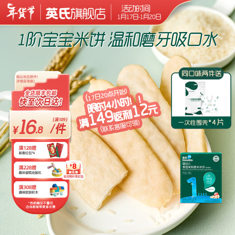 ¥16.8 英氏(Engnice)【米饼专区】婴幼儿宝宝零辅食磨牙米饼干茉莉香米蟹田大米辅食 茉莉香米米饼(苹果味) 19.8