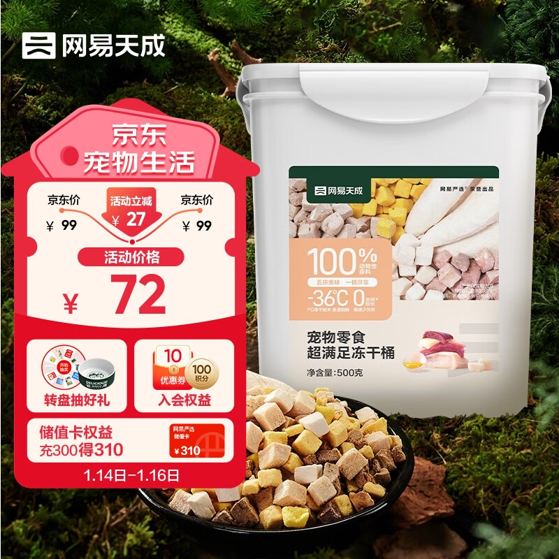 ¥67 网易天成严选宠物零食冻干桶鸡肉零食 犬猫通用冻干零食冻干五拼桶 500g 72