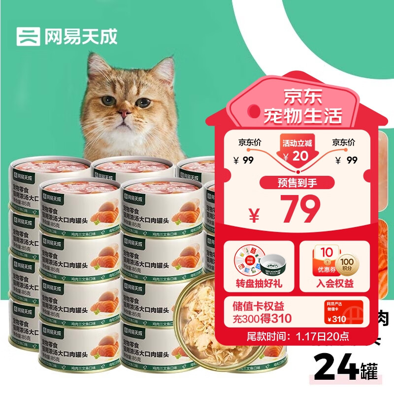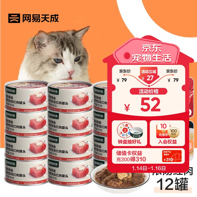 ¥47 网易天成严选猫湿粮零食浓汤红肉罐头 金枪鱼扇贝口味85克*12罐 52