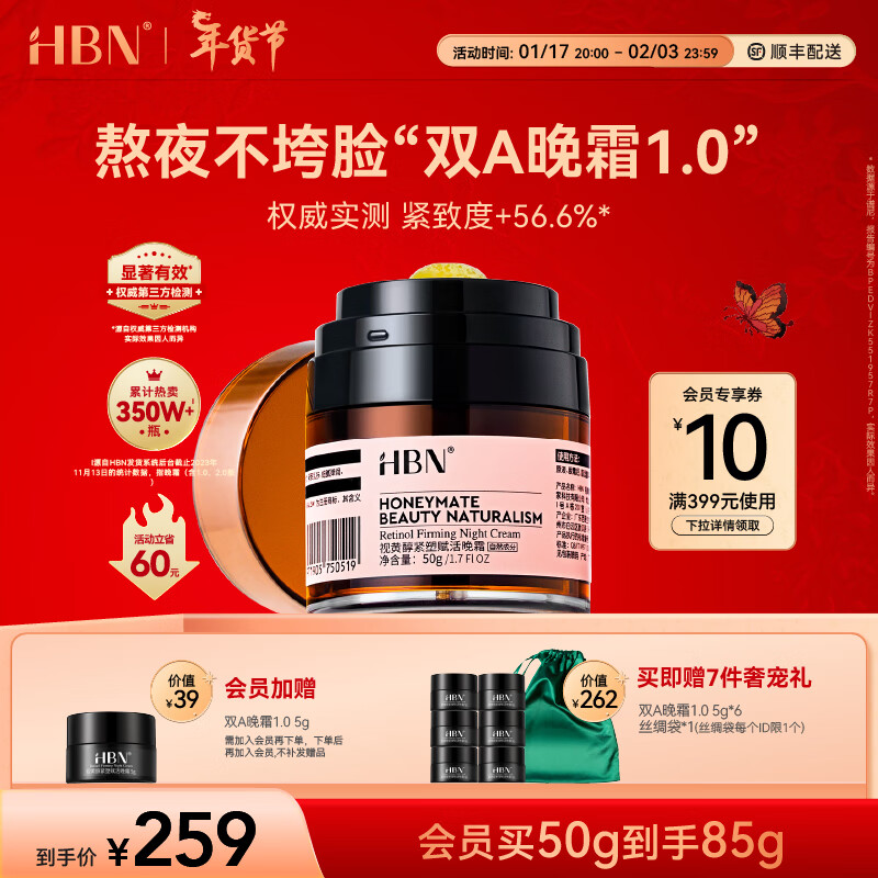 ¥259 HBN视黄醇双a醇晚霜精华面霜早C晚A提拉紧致抗皱淡纹控油保湿 50g 289