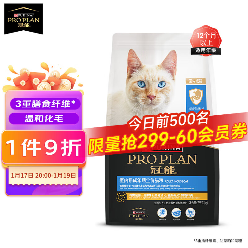 ¥291 冠能猫粮 室内成猫猫粮7kg 添加膳食纤维 控制毛球 396
