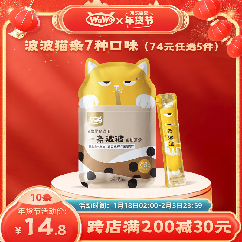 ¥9.8 WOWO猫条猫零食 幼猫成猫通用猫湿粮 一条波波吞拿鱼蛋黄味12g*10条 14.8