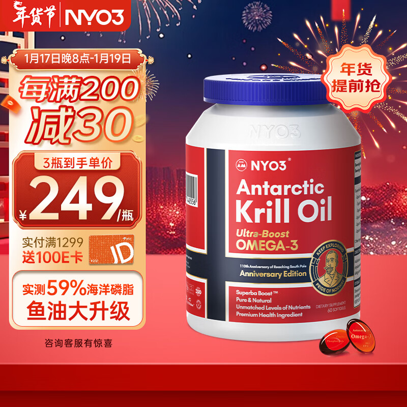 ¥309 NYO3诺威佳 纯南极磷虾油阿蒙森纪念版60粒装 鱼油升级56%磷脂DHA EPA omega-3中老年成人 海外进口 329
