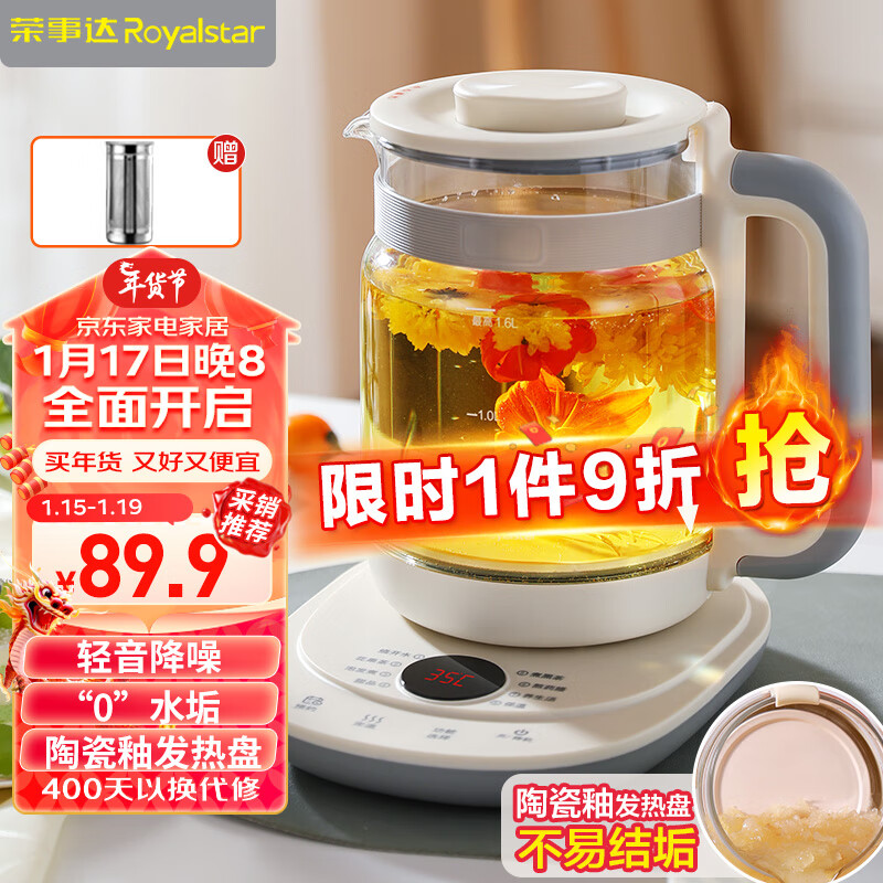¥99.8 荣事达(Royalstar)养生壶烧水壶1.6L家用智能保温陶瓷釉降噪涂层电热水壶开水壶润养壶玻璃花茶壶YSH1785(T) 99.9