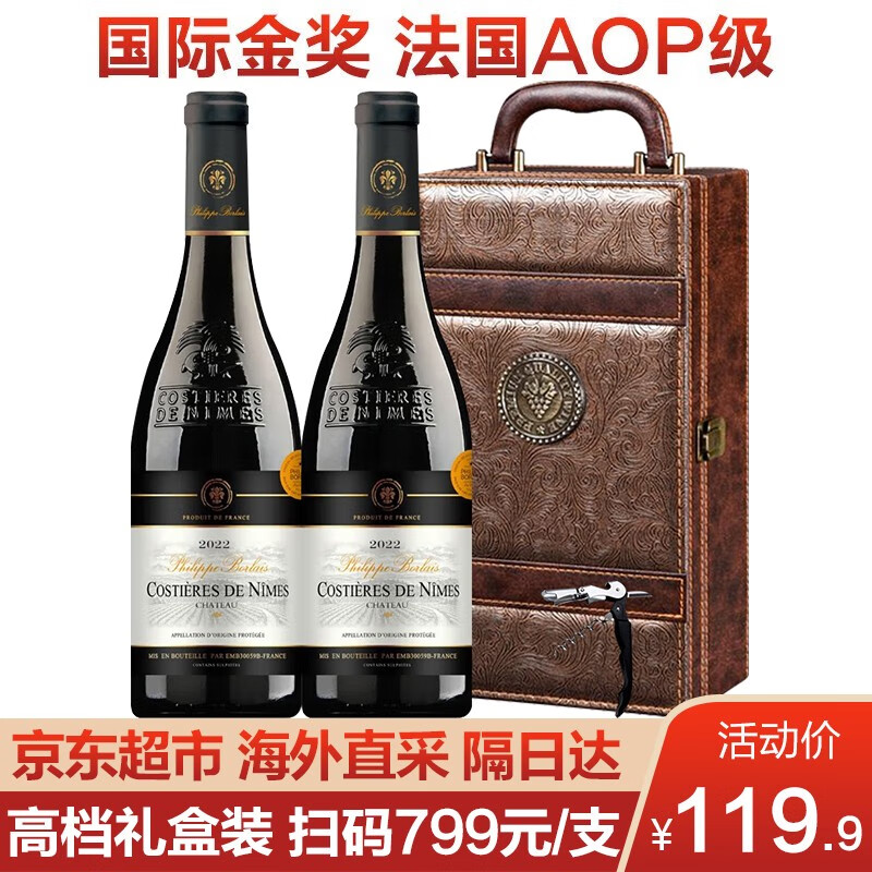 ¥189.9 菲利宝莱(Philippe Borlais)法国进口尼姆AOP级红酒礼盒2支装 庄园14.5度干红葡萄酒送礼 219.9