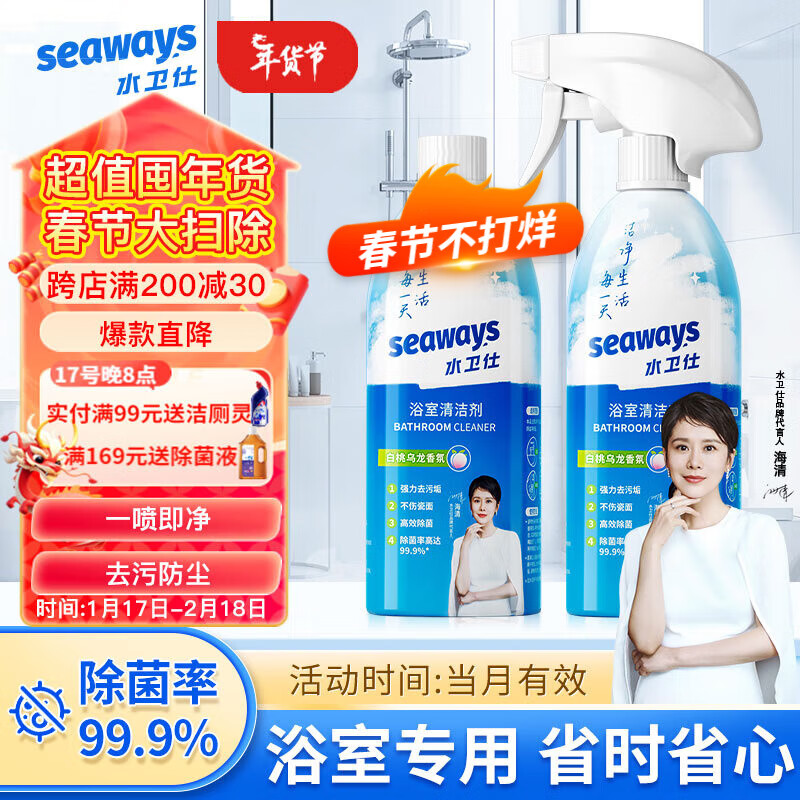¥15.9 水卫仕(seaways)浴室清洁剂 玻璃水垢清洁剂瓷砖浴缸水龙头花洒去垢除菌清洗剂 浴室净500ml*2 25.9
