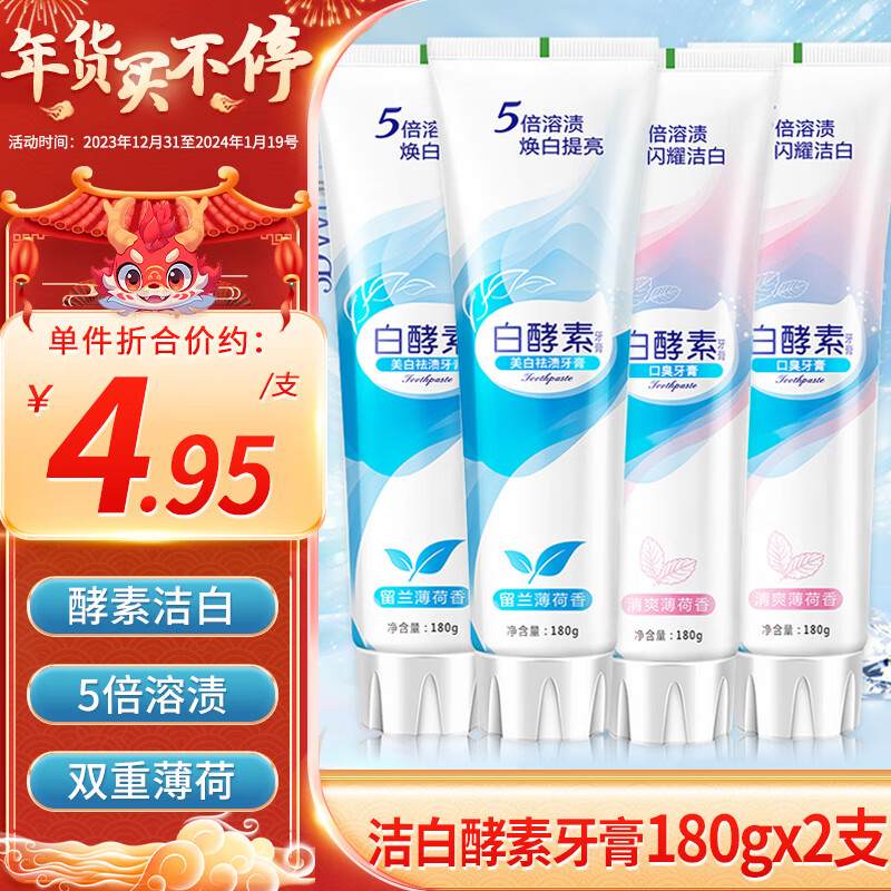 ¥9.9 益口宁白酵素牙膏牙齿洁白清新口气减少牙渍牙亮白美小苏打牙膏 酵素牙膏180g*2支 39.9