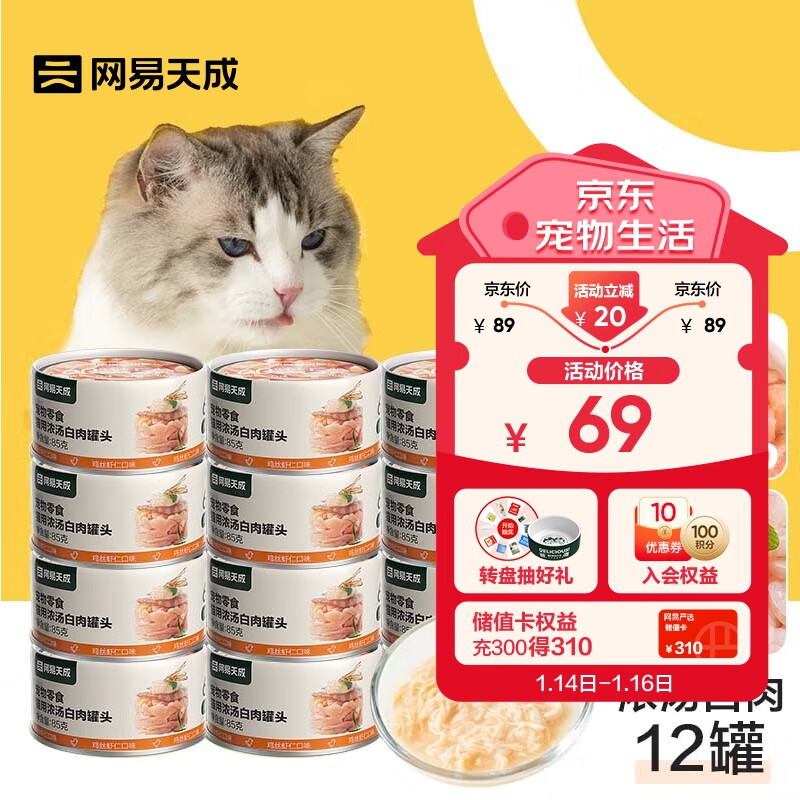 ¥64 网易天成猫罐头猫湿粮宠物零食猫用浓汤白肉罐头鸡丝虾仁口味85克*12罐 69