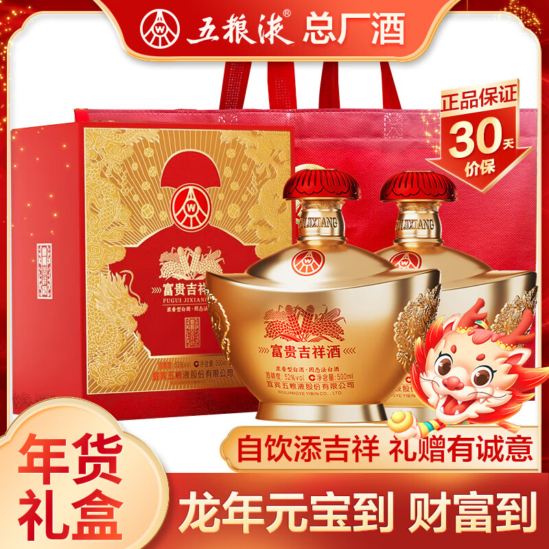 ¥796 五粮液富贵吉祥金元宝浓香型白酒52度500ml礼盒2瓶送礼龙年货节纯粮酒水 856