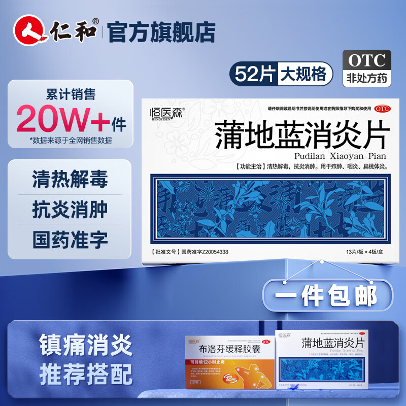 ¥23 仁和 恒医i森蒲地蓝消炎片52片/盒 清热解毒 抗炎消肿 用于咽炎 扁桃腺炎 疖肿 2盒装 30