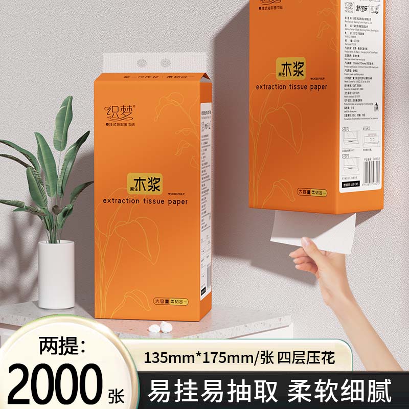 ¥6.9 织梦悬挂式抽纸纸巾家用纸抽四层1000张卫生纸 2提(送挂钩) 9.9