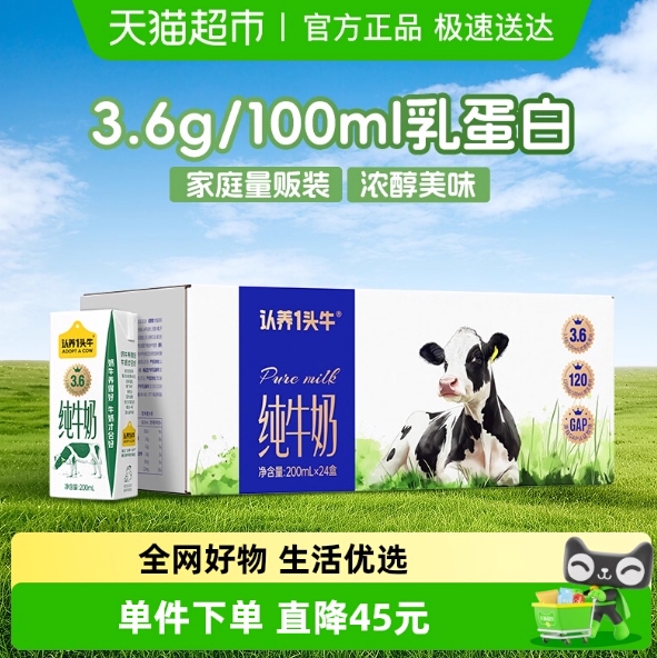 30.2元包邮!认养一头牛纯牛奶200ml 24盒