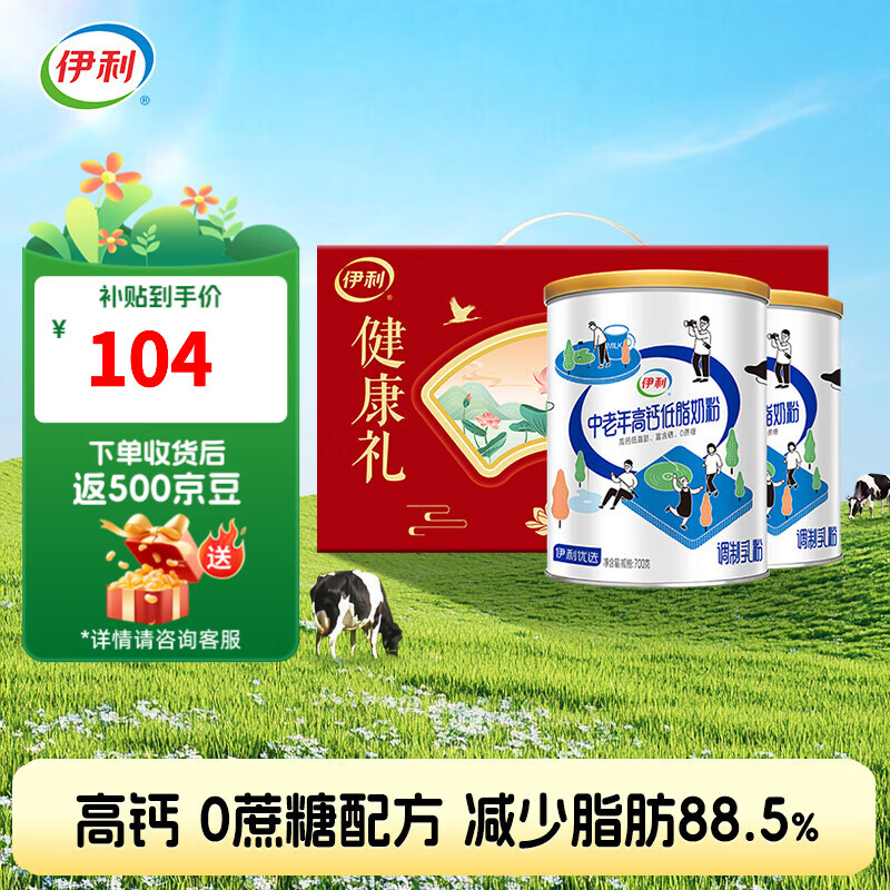 伊利中老年高钙低脂奶粉礼盒700g*2罐,年货节到手价37元/罐